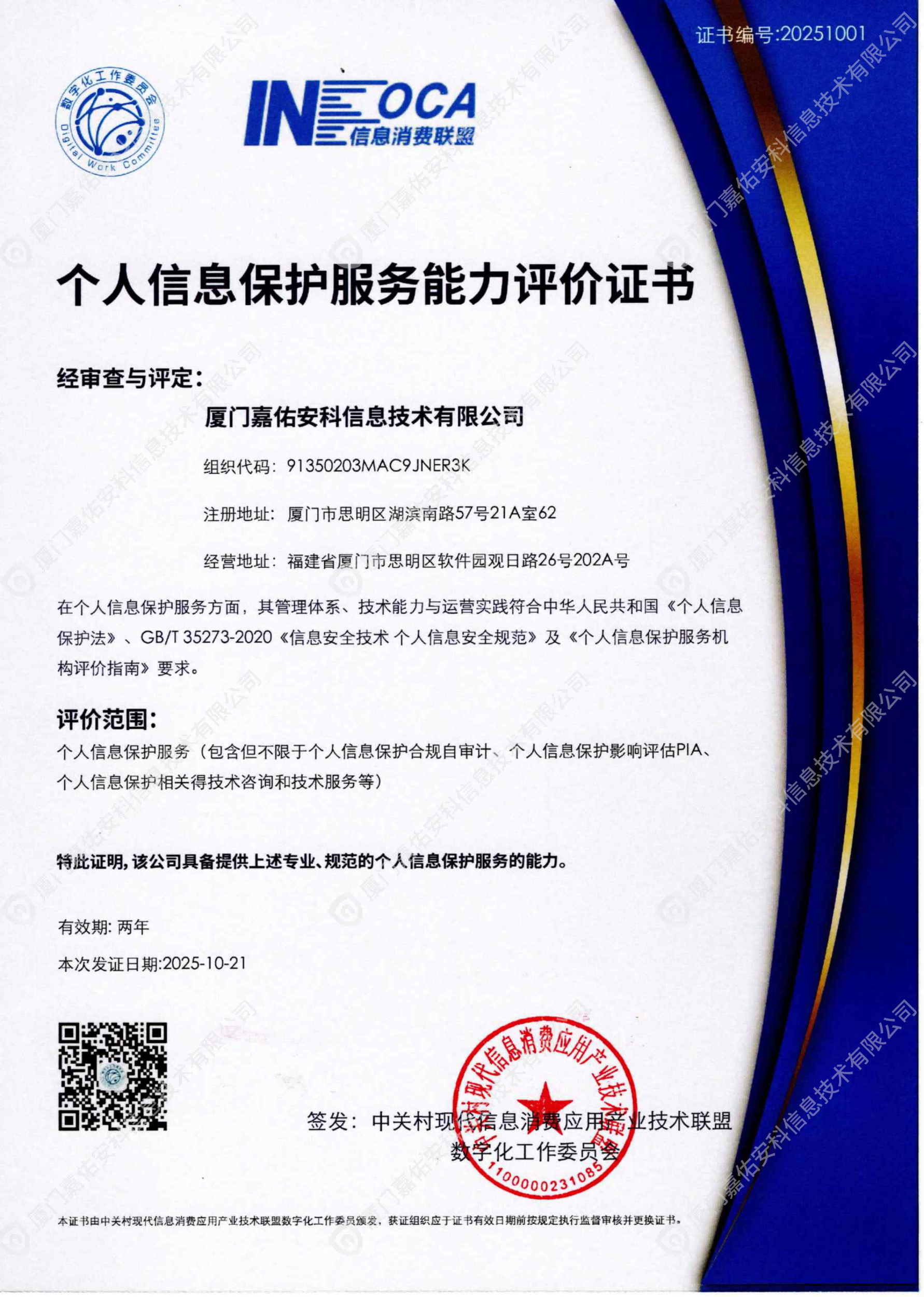 嘉佑安科喜讯 | 厦门嘉佑安科荣膺数工委能力评价证书!以专业之力筑牢个人信息安全防线